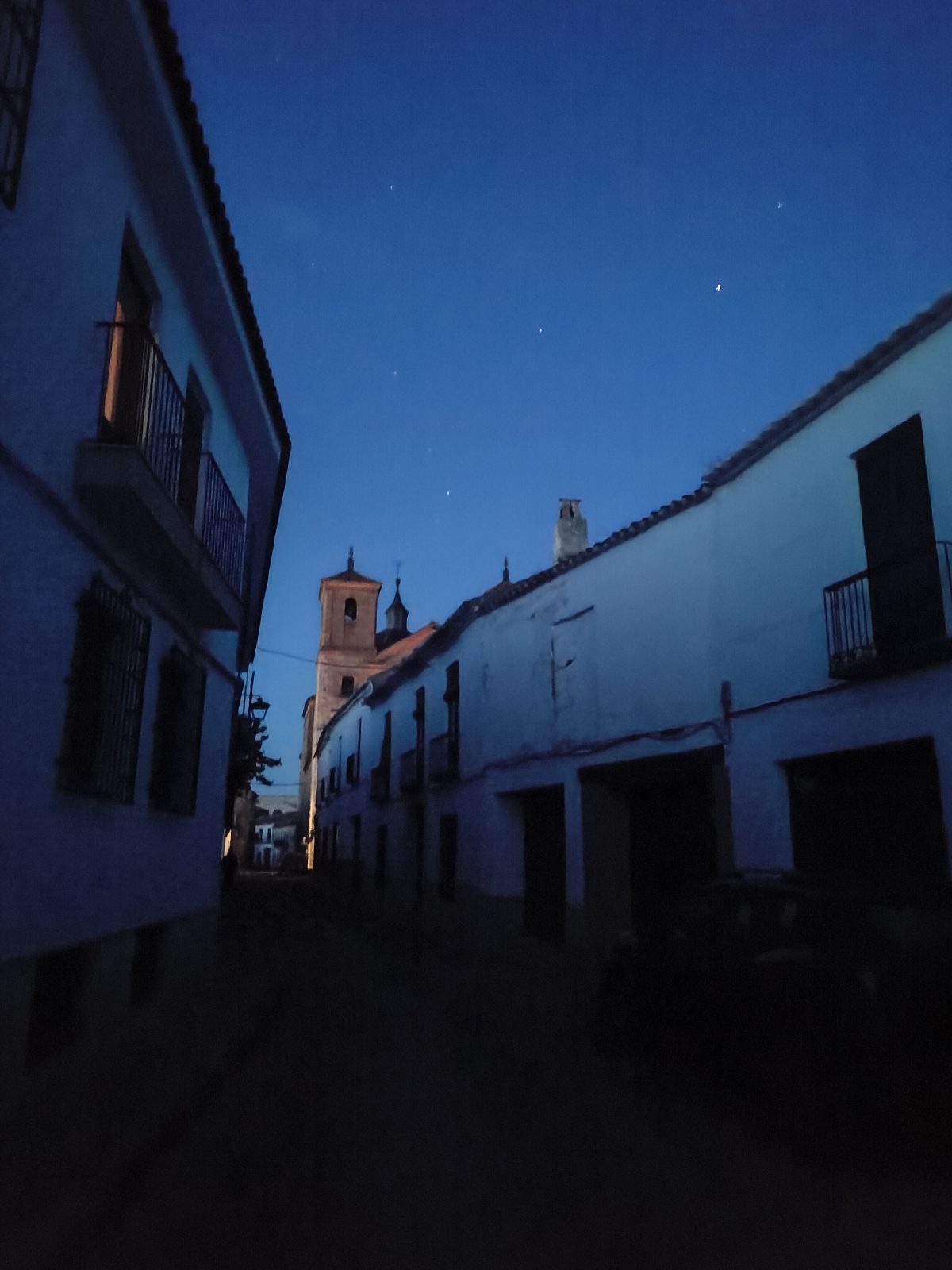 Y cuando anocheció totalmente salí a dar una vuelta al pueblo para verlo sin farolas. Por el tiempo de exposición del modo noche parece que hay más luz pero en persona se veía 0.